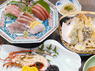 メニュー内容:①お刺身の盛合せ、②煮魚、③天麩羅、④さざえの壺焼き、⑤茶わん蒸し、⑥ご飯・お味噌汁・お漬物、⑦伊勢海老料理